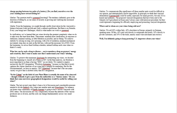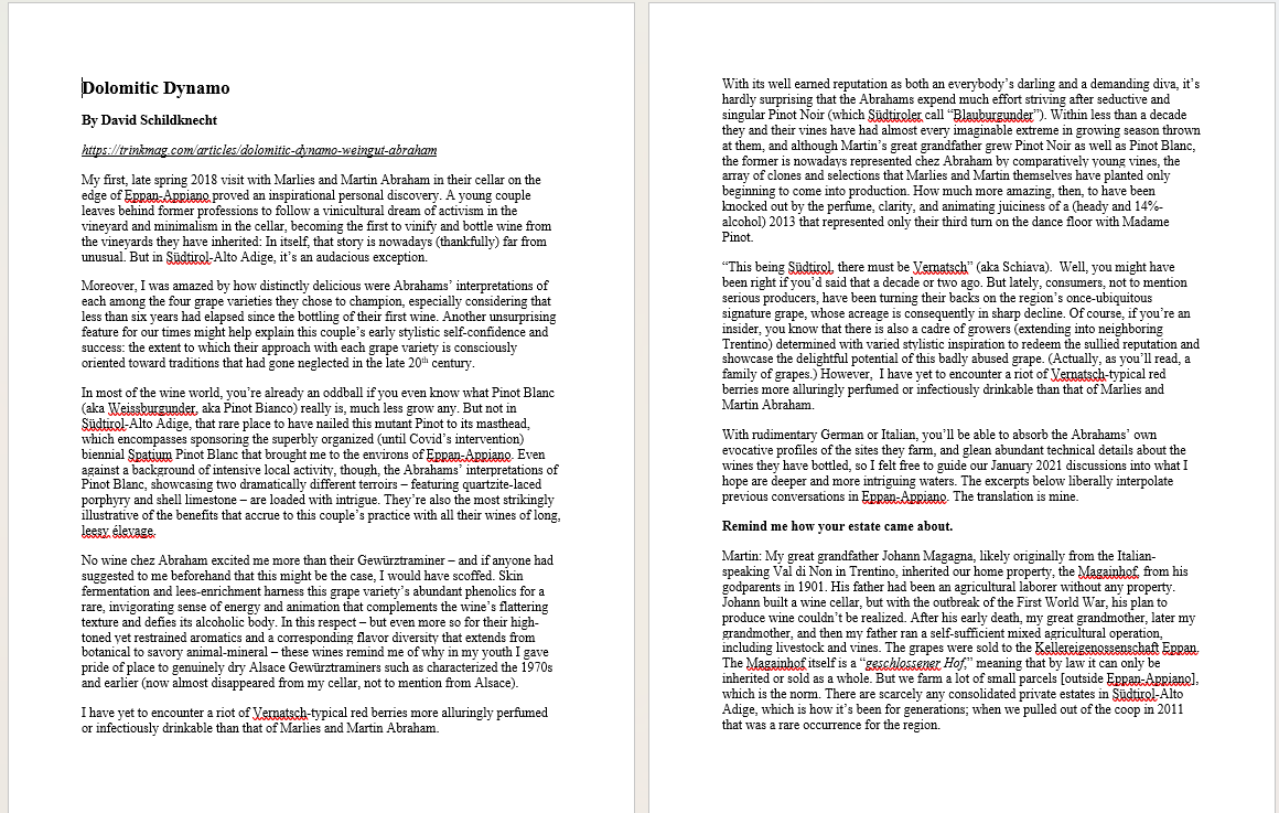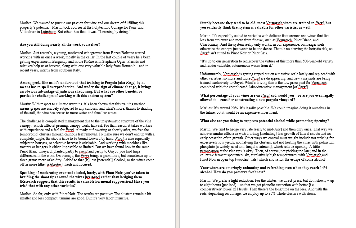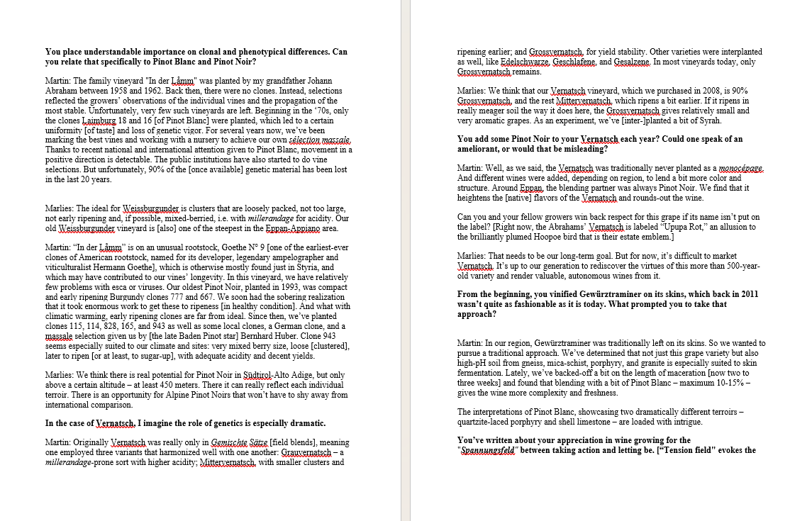 We take very pride in this interview by the American wine critic David Schildknecht! We talked about our philosophy, pergola , the Eppan areas, global and phenotypical differences, geographical designations an even more!