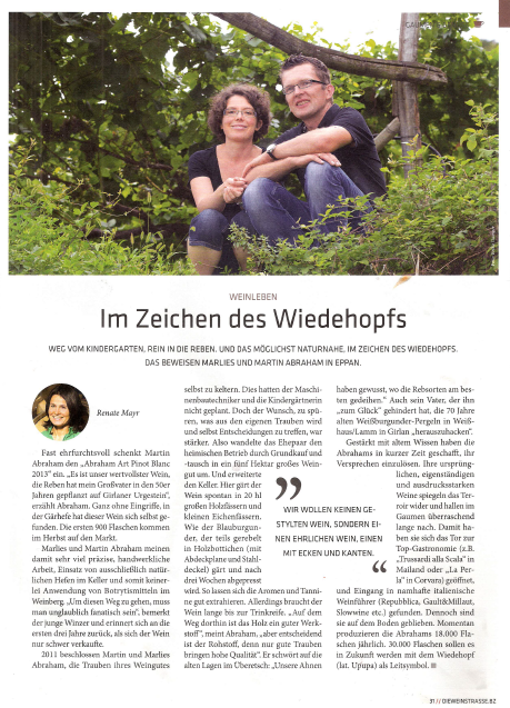 "L’ho già scritto e lo confermo: il Blauburgunder 2011 di Martin e Marlies Abraham è per quanto mi riguarda il più straordinario Pinot Nero mai prodotto in terra italica.